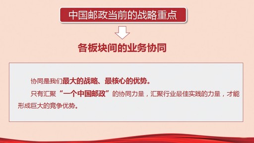 党课关于中国邮政当前的战略重点就是“各板块间的业务协同”这一论述,让人印象深刻,既有立足现代中国邮政发展的历史视野、大局格局,又体现了基于新时代,基于高科技、大数据广泛运用所带来的新的危机与挑战下的竞争力思考与选择。党课强调,协同是中国邮政最大的战略、最核心的优势。协同的作用是整体远远大于部分的简单加总,但更多的时候是n次幂关系。只有汇聚“一个中国邮政”的协同力量,汇聚行业最佳实践的力量,才能形成巨大的竞争优势。