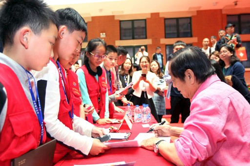 5月10日,“与艺术大师面对面”韩美林上海邮迷见面会在上海市邮政分公司邮政大楼中庭举行。见面会上,韩美林讲述了自己的“邮票情缘”,并为从四面八方赶来的各个年龄段的邮迷在己亥年生肖邮品和集邮文化丛书《美林邮缘》上签名,还特地为多位“资深邮迷”手绘生肖猪。一位排了3小时队拿到大师签名的年轻邮迷激动地说:“我特地连夜从杭州乘火车赶来,能够一睹大师风采,觉得特值。”图为韩美林为慕名前来的《小主人报》的小记者们签名。  □上海记者  周炼 摄影报道