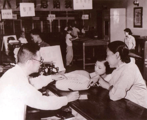 1958 年,东四邮局主动改善服务,资深营业员于洪泽(左一),是在旧中华邮政工作过22 年的邮务佐,深信不能替用户写字的老规矩没有错,经过服务思想教育,他告别了以前的自己,主动为用户填写单式。