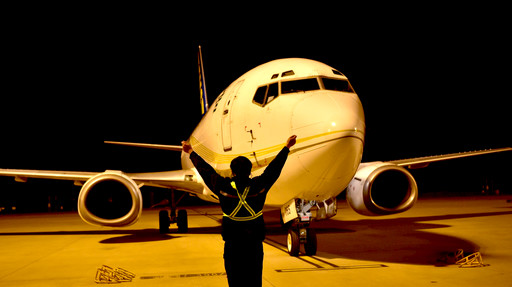 11月11日凌晨,中国邮政航空公司南京分公司机务人员正在引导飞机入位。□刘立明 摄影报道