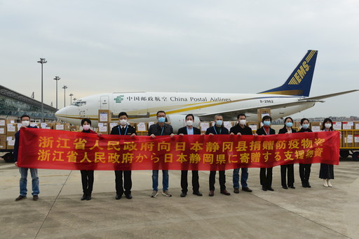 3月12日11时,浙江省政府向日本和韩国捐赠防疫物资的交接启运仪式在义乌机场举行。浙江省政府外事办公室、省经信厅将物资交付浙江省邮政分公司承运。此次捐赠物资包含了口罩、防护服、护目镜等共计近千箱防疫物资,其中捐赠日本的物资将由中国邮政“义乌—大阪”邮航货运包机直航送达。自2月6日浙江省分公司开通“义乌—大阪”往返邮航货运包机海外捐赠“绿色通道”以来,已完成多批次防疫物资的运输工作,使义乌成为防疫物资捐赠和运输的一个重要口岸。□厉楠  摄影报道