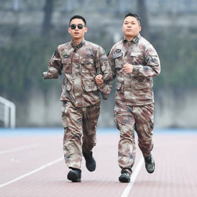 2020年1月2日,“排雷英雄战士”杜富国(左)和战友在陆军军医大学操场上跑步。新华社记者 王全超 摄