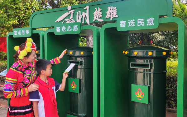 楚雄市北浦小学的学生们来到了体验区。邮政员工向他们介绍了楚雄发展的历程、邮票的诞生、彝绣的种类。学生们现场写明细片,把自己的故事和心愿写在纸上,在寓教于乐中了解传统书信文化。
