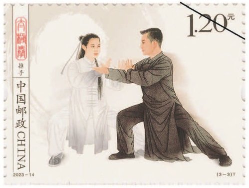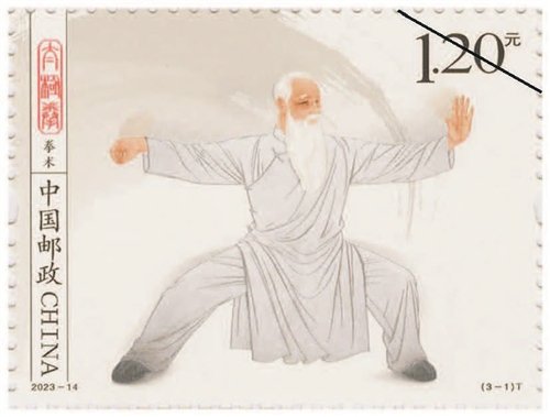 该套邮票一套3枚,图案内容分别为拳术、器械、推手。邮票采用工笔人物形式表现,整体色调以黑白灰为主,背景采用水墨飞白映衬太极拳平和、包容、大道至简的意境。第一枚邮票表现了一位白发长须老者,正气定神闲地做着太极拳单鞭动作,体现出太极拳的传统风范和延年益寿的作用。背景用挥洒自如的水墨笔触和肌理来表现,伴随老者动作产生无形气韵。第二枚邮票中是一位英姿飒爽的舞剑女子,背景中如影随形的气流若隐若现,体现出太极剑行云流水的特点。第三枚邮票中是一对进行太极拳推手的男女青年,一男一女、一黑一白象征太极的阴阳相济,背后的水墨肌理隐约形成阴阳的概念,刻画出“阴阳太极本相随、动静虚实把手推”的场景。