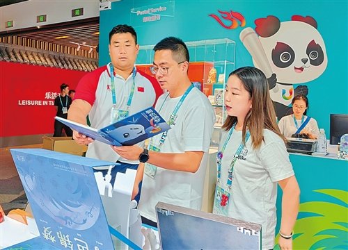 邮政工作人员向运动员细致介绍大运会文化产品。