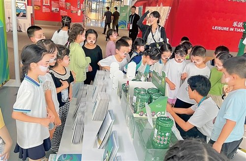 小朋友们对大运村邮政服务点位里的各式大运会邮品非常感兴趣。
