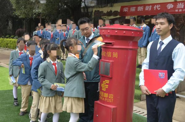 10月9日——“世界邮政日”,昆明吴井路邮政支局工作人员前往明通小学开展公益活动,带领青少年们了解寄信的流程,开展金融知识进校园、爱心邮件等活动。