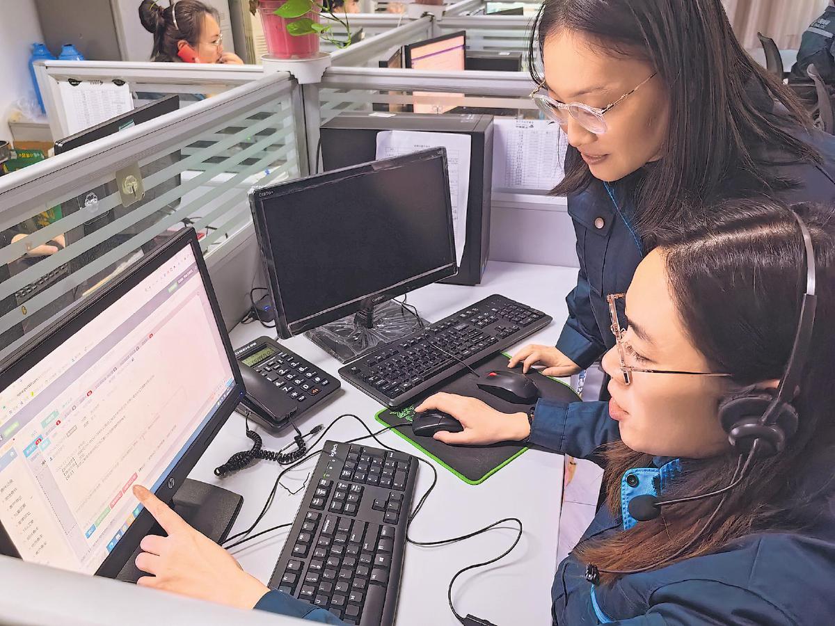 石家庄快包部客服中心员工探讨如何满足客户提出的售后服务需求。□吴海玲 摄