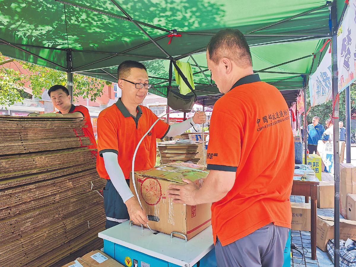 肖梅滨(中)和同事正在打包邮件。