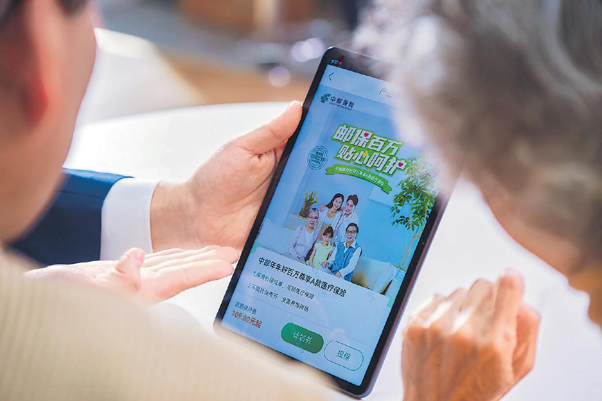 中邮保险济南市网点内,服务人员向客户展示健康、养老保险产品的可视化详情,科技感中传递着专业与温度。