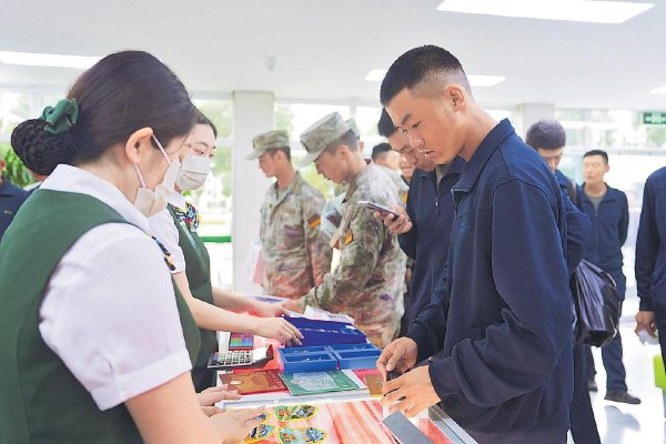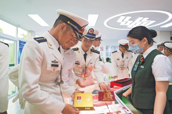 在邮政服务区,官兵们正在仔细挑选邮政文创产品。
